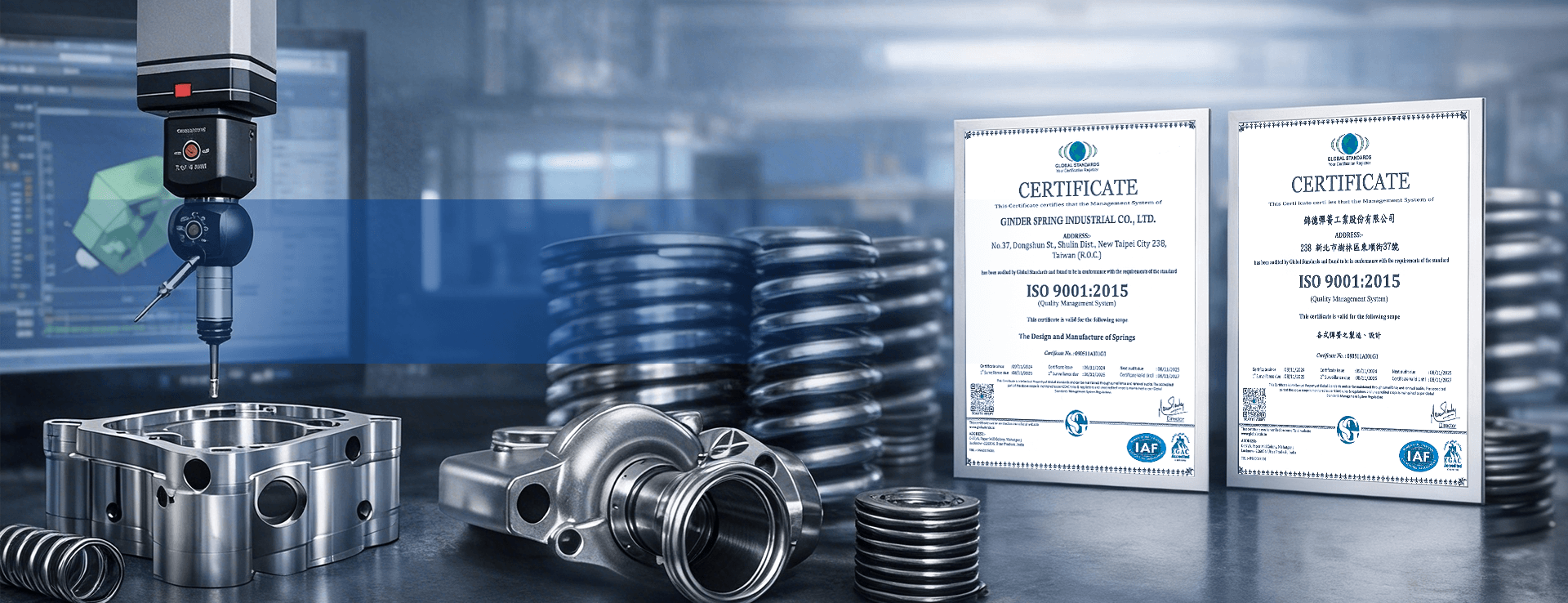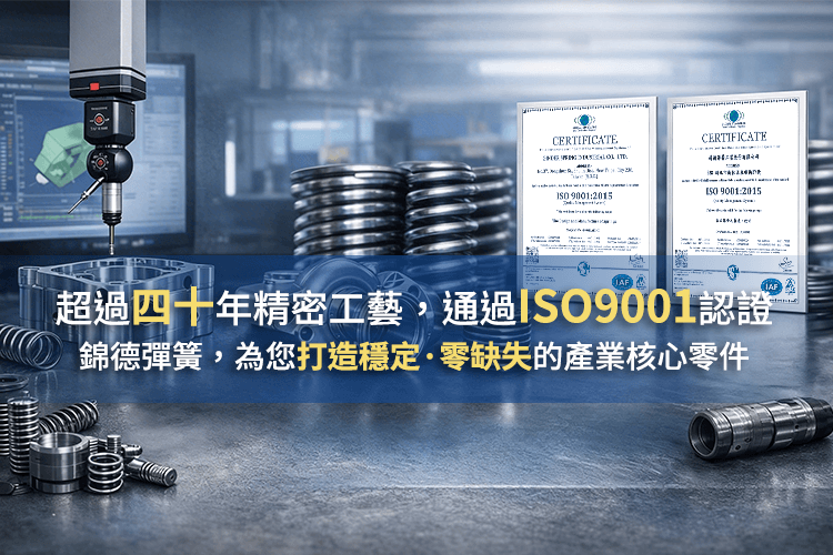 為確保產品卓越性能,我們配置了拉壓、扭力、硬度及疲勞試驗機等精密檢測設備。錦德彈簧已通過 ISO 9001 國際品質認證,以嚴謹的態度服務全球客戶。