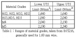 鋼線線徑低於 2.00 mm ,特別是標準冷抽 BS5216, S202 及 DEF106 等碳鋼最強硬。這些材料在強度及表面磨光達一定標準所以較容易符合彈簧端部上一定要求。舉例來說、線徑為 1.60 mm,BS5216 材料等級一般使用情況如表1。